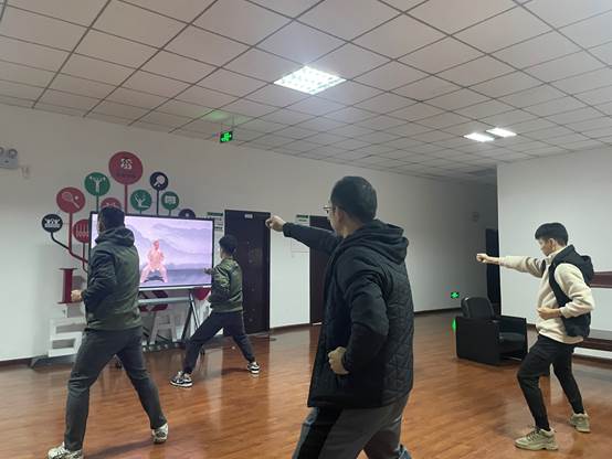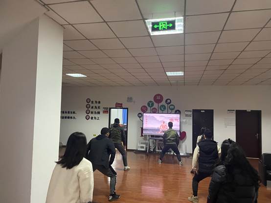 每天上午10点,小组成员纷纷来到办公楼大厅,跟随教学视频、伴着舒缓的节奏,调整呼气、凝神聚气,认真跟练完一整套气功动作:两手托天理三焦、左右开弓似射雕、调理脾胃须单举、五劳七伤往后瞧摇头摆尾去心火、两手攀足固肾腰、攒拳怒目增气力、背后七颠百病消。在这短暂的休息时间,老师们忙里偷闲,暂时忘却了工作的繁忙和疲惫,身心得到了充分放松。