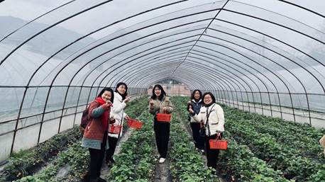 雅安校区工会小组的活动为“采摘春天的味道”。在这个阳光明媚的日子里,女教职员工们前往位于郊外的余家村草莓基地,体验了一次别开生面的采摘活动。草莓基地里,红彤彤的草莓挂满枝头,散发着诱人的香气。大家或弯腰或蹲下,小心翼翼地挑选着最红、最熟的草莓。笑声和谈话声交织在一起,构成了一幅温馨和谐的画面。