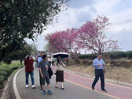 老师们走进牛碾坪万亩观光茶园和新店镇龙滩子乡村振兴项目“百万樱花园”进行参观游览。一路上,老师们或是在花树下拍照留念,或是在茶园游步道上悠闲漫步,享受着花树与茶园交相辉映的美景,切身感受古人“等闲识得东风面,万紫千红总是春”的意境,以及“一芽一叶一抹香,一人一篓采茶忙”的农忙时节风景。