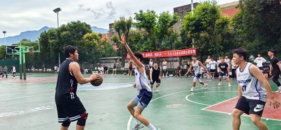 本次篮球联谊赛由教师和学生组成两只参赛队伍,多位已经毕业的学生专程赶回学校为师生呐喊助威。随着裁判哨声响起,队员们纷纷腾空跃起抢夺首球,一刹那间,场下响起铺天盖地的加油声和欢呼声。师生们一个个化身“运动健将”,激烈的抢夺,精彩的抢断,有力的盖帽,精准的投篮……队员们围追堵截,默契配合,你来我往间,局势瞬息万变,比赛高潮迭起。