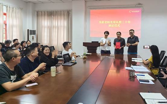 9月24日,艺术与传媒学院在学院会议室举行隆重仪式,学院领导为学院退休教师朱彬教授颁发了光荣从教三十年荣誉证书。朱彬教授以其深厚的学术造诣、严谨的教学态度和对学生无微不至的关怀赢得了师生的广泛肯定。