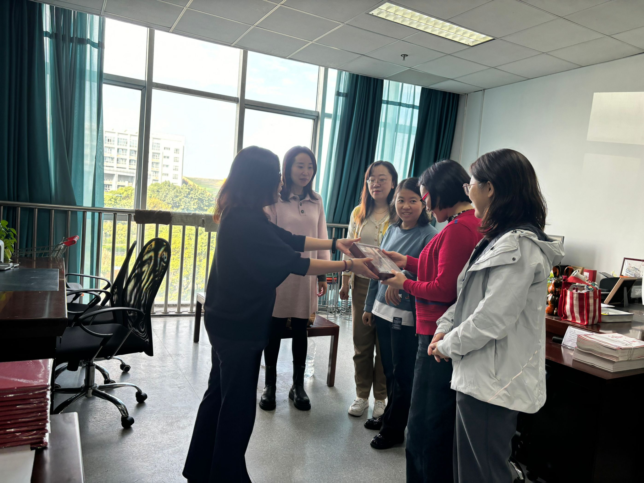 2024年7月10日,资源学院工会主席、党委书记张宏霞代表学院工会及领导班子在放假之际,表达了对行政老师过去一学期兢兢业业坚守岗位表示亲切慰问和感谢,并送上精心准备的慰问品,嘱咐大家做好暑期防暑降温工作,劳逸结合。资源学院行政小组是一个学院的坚强后盾,希望大家继续为学院教师做好各项保障工作。