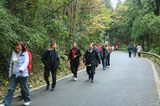 初冬时节,灵岩山教学科研实习基地十分幽静,山林间火红的枫叶、焦糖色的梧桐叶、深红的杉叶,还有常绿的阔叶树木,各种颜色交相辉映,给人一种无尽的美感。教职工们个个精神抖擞,呼吸着新鲜的空气,沿着山路迈着矫健的步伐一步步迈向终点。大家三两结伴而行,一边走一边亲切的交流,相互鼓励、欢声笑语,享受着一路美好的风景和运动的快乐。