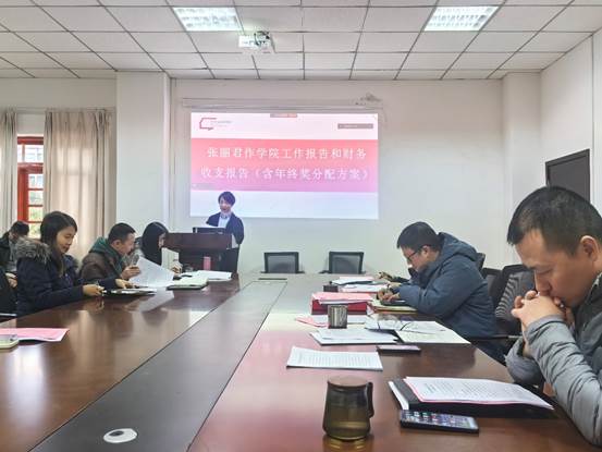 正式会议阶段在庄严的国歌声中拉开帷幕。学院院长张丽君在大会上作学院工作报告、财务收支报告和年终奖分配方案说明。张院长详细介绍了过去一年学院在全面从严治党、教学科研、人才培养、社会服务等方面取得的成绩,感谢全体教职工在过去一年为学院发展所做出的共同努力,同时也强调了学院工作中存在的问题,并围绕“活力艺传、开放艺传、奋进艺传”三个方面对2025年工作进行了部署:一是强化学院学科专业氛围建设;二是深化教育教学改革,不断提高人才培养质量;三是推进一流学科建设、课程团队建设和规划教材建设。