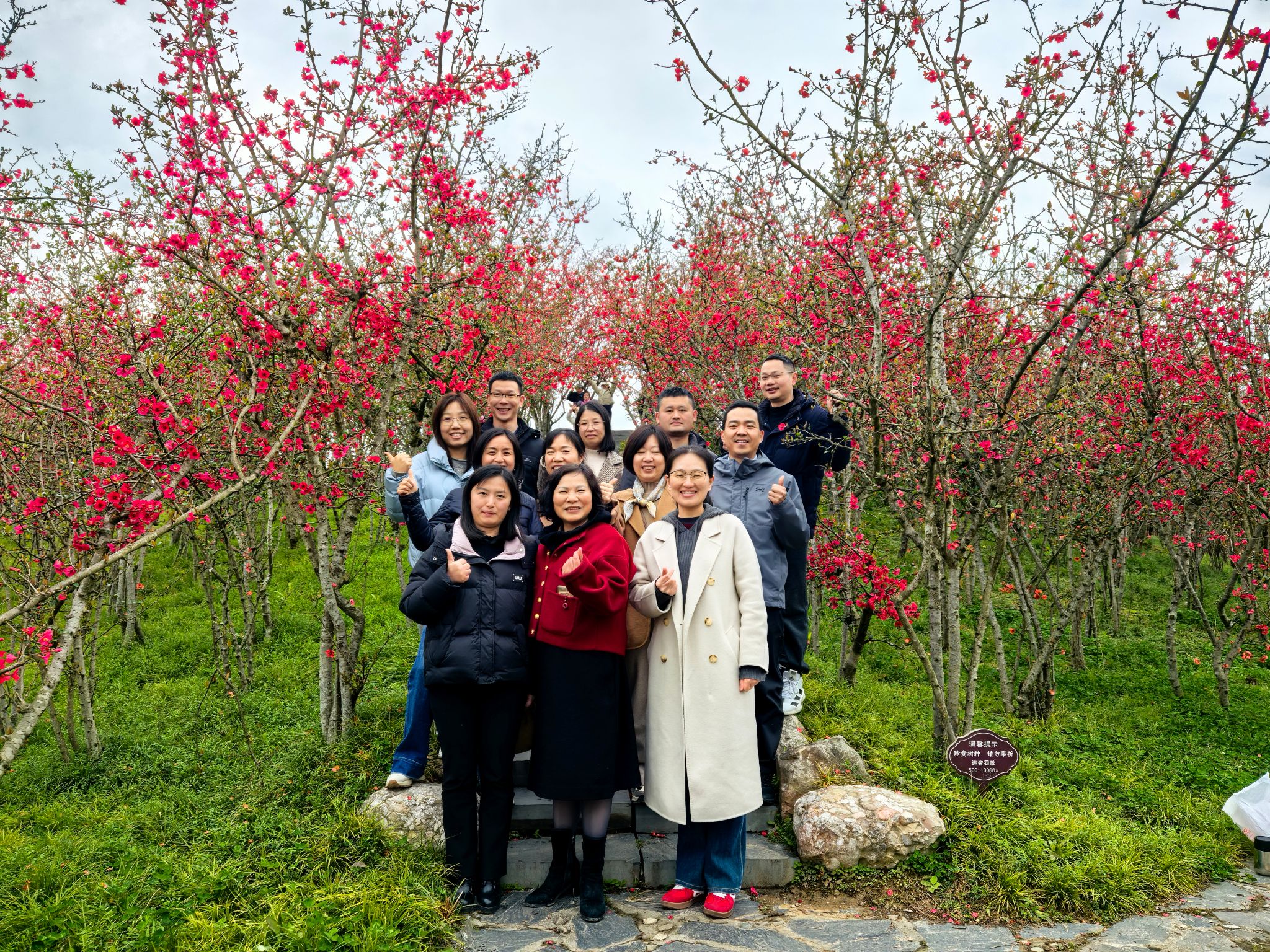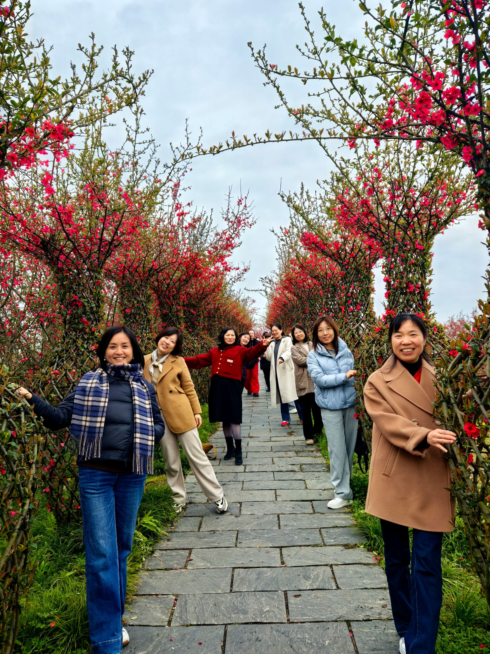 活动当日,会员们从成都校区集合出发,前往位于青城山脚下的问花村。作为成都市乡村振兴重点示范项目,问花村以千亩花海为核心,融合古典园林艺术与现代农旅产业,打造出梅园、海棠园、紫薇园等特色园区。正值春日盛景,梅花竞放、海棠垂丝,会员们漫步于诗意的花径间,深入了解“诗、酒、花、水、村”的文化主题,切身感受花卉产业带动乡村经济的蓬勃活力。