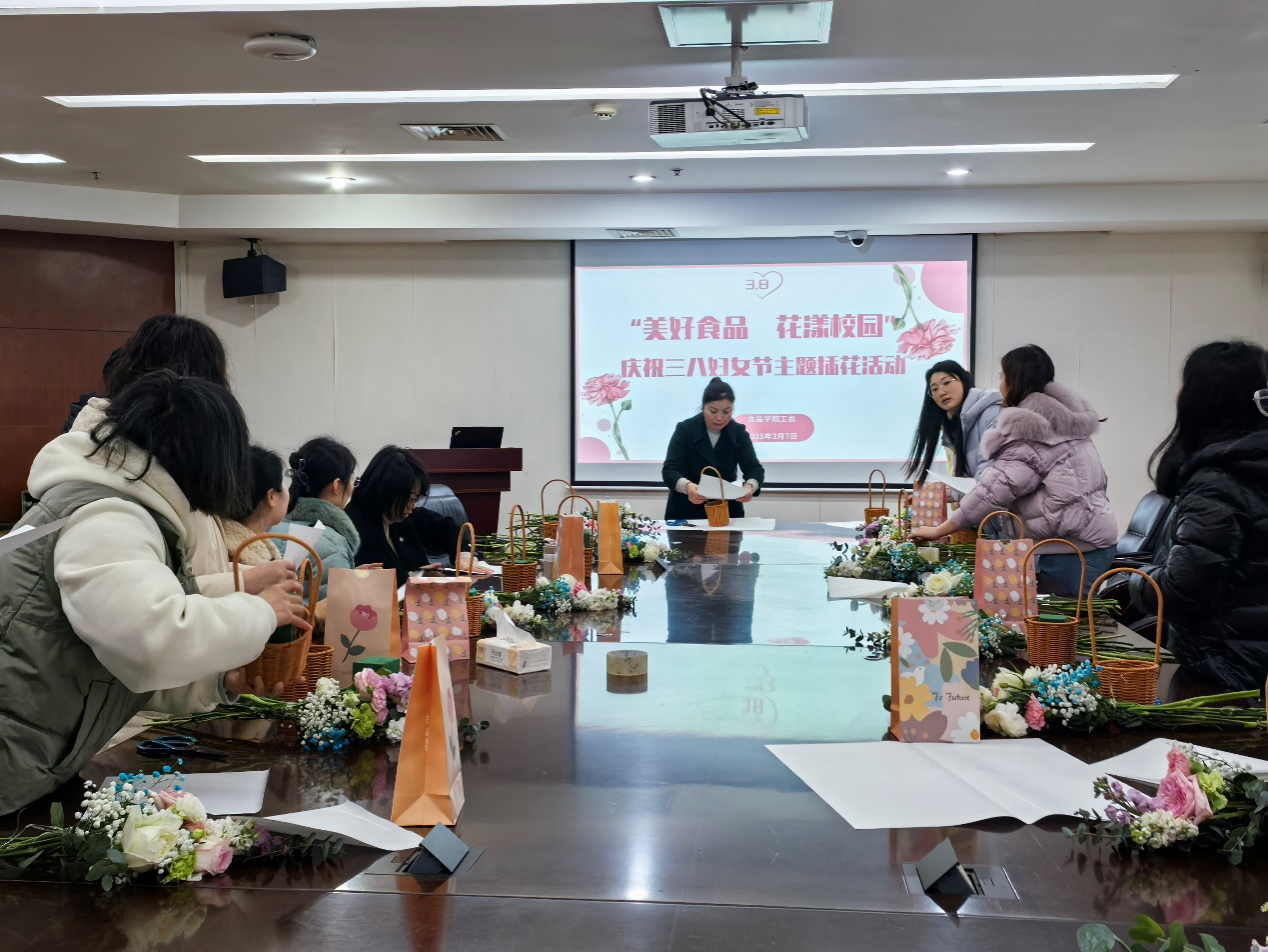 3 月 7 日上午,食品学院工会在综合楼 214 会议室举办了 “美好食品,花漾校园”庆祝三八妇女节主题插花活动,全院女教职工齐聚一堂,共庆“三八” 国际劳动妇女节。