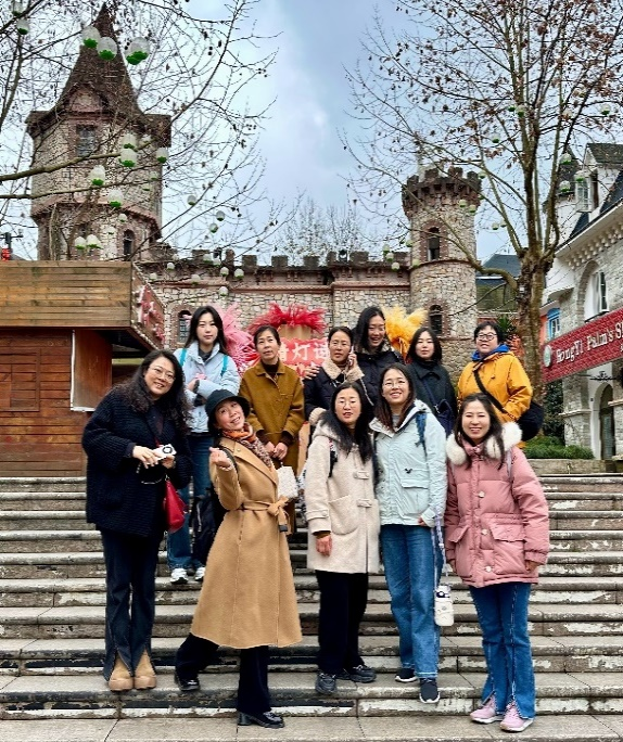 女职工们在欢声笑语中开启了别具意义的踏青之旅。首站抵达白鹿中法风情小镇,欧陆风情的建筑群错落有致,色彩明快的墙体与精致的街景相得益彰,让人恍若置身异域。老师们信步于青石板铺就的街道,用镜头捕捉法式浪漫与川西风情的完美交融。随后,众人探访了始建于1908年的白鹿上书院,这座融合哥特式与川西民居风格的百年建筑巍然矗立,青砖灰瓦间镌刻着时光的印记,散发着庄重典雅的历史气息。