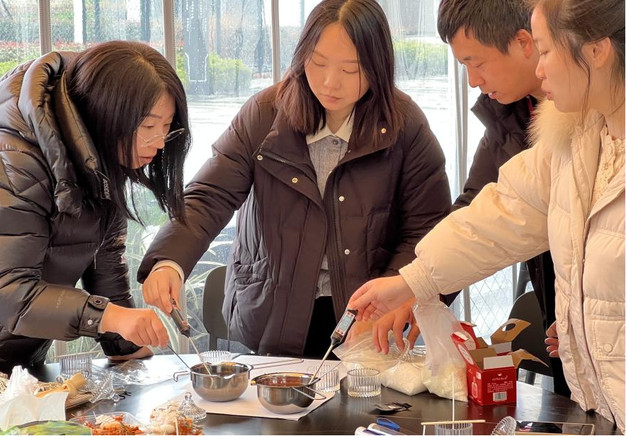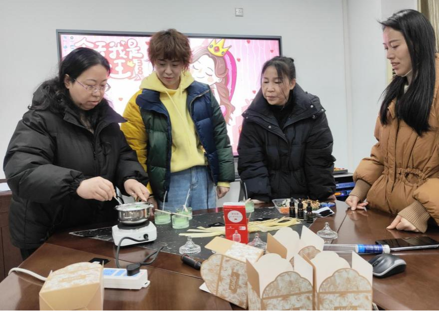 活动现场,女教师们化身“调香师”,按照香薰制作流程,调配精油、设计香薰蜡片,从选材、融蜡到定型,每一步都充满欢声笑语。清新的海洋香、舒缓的薰衣草、温暖的檀香……香气交织间,既展现了她们的巧思与审美,也让日常忙碌于教学保障、信息化建设与管理服务的“巾帼能手”们得以放松身心,感受生活的诗意与温度。
