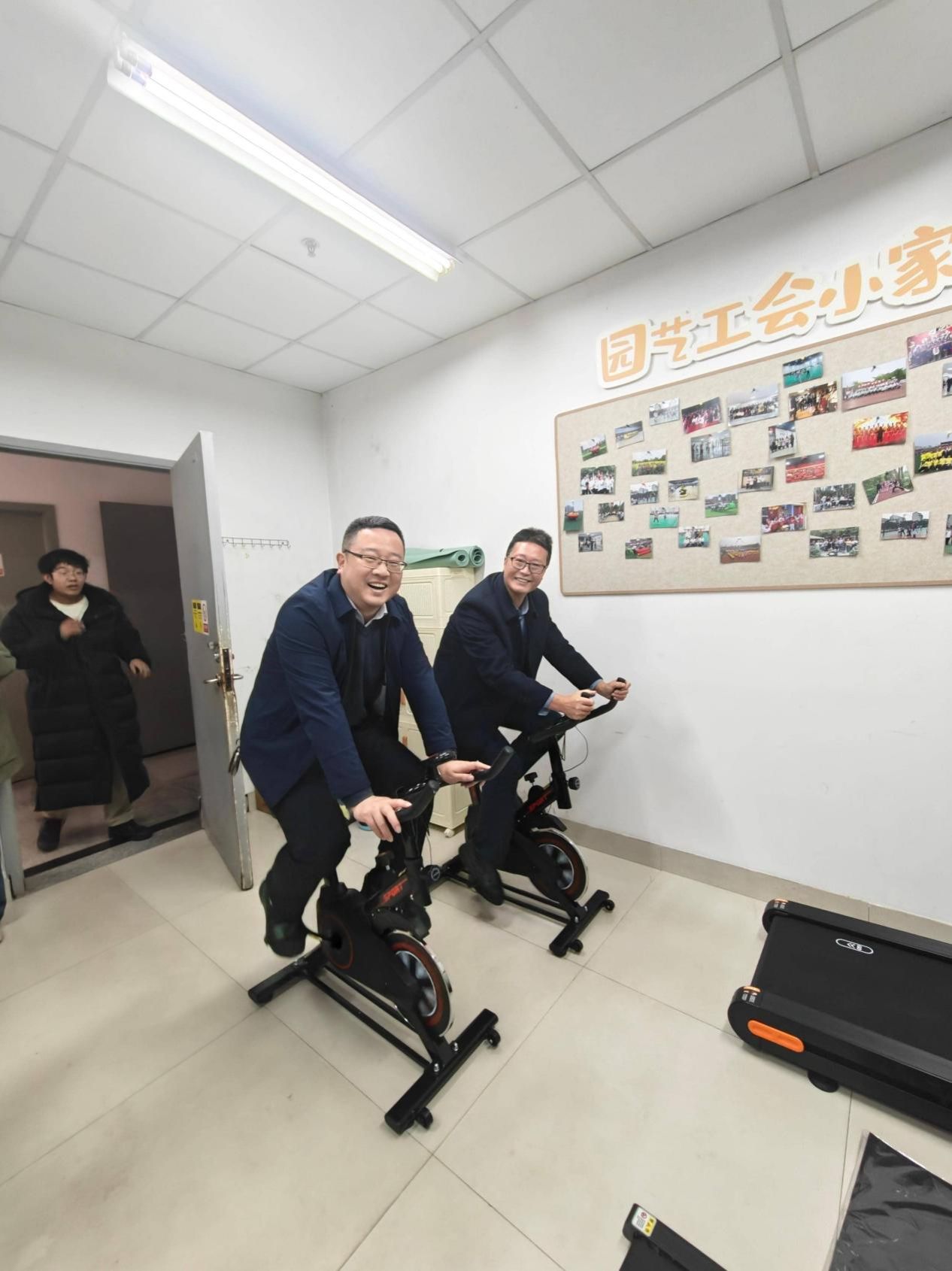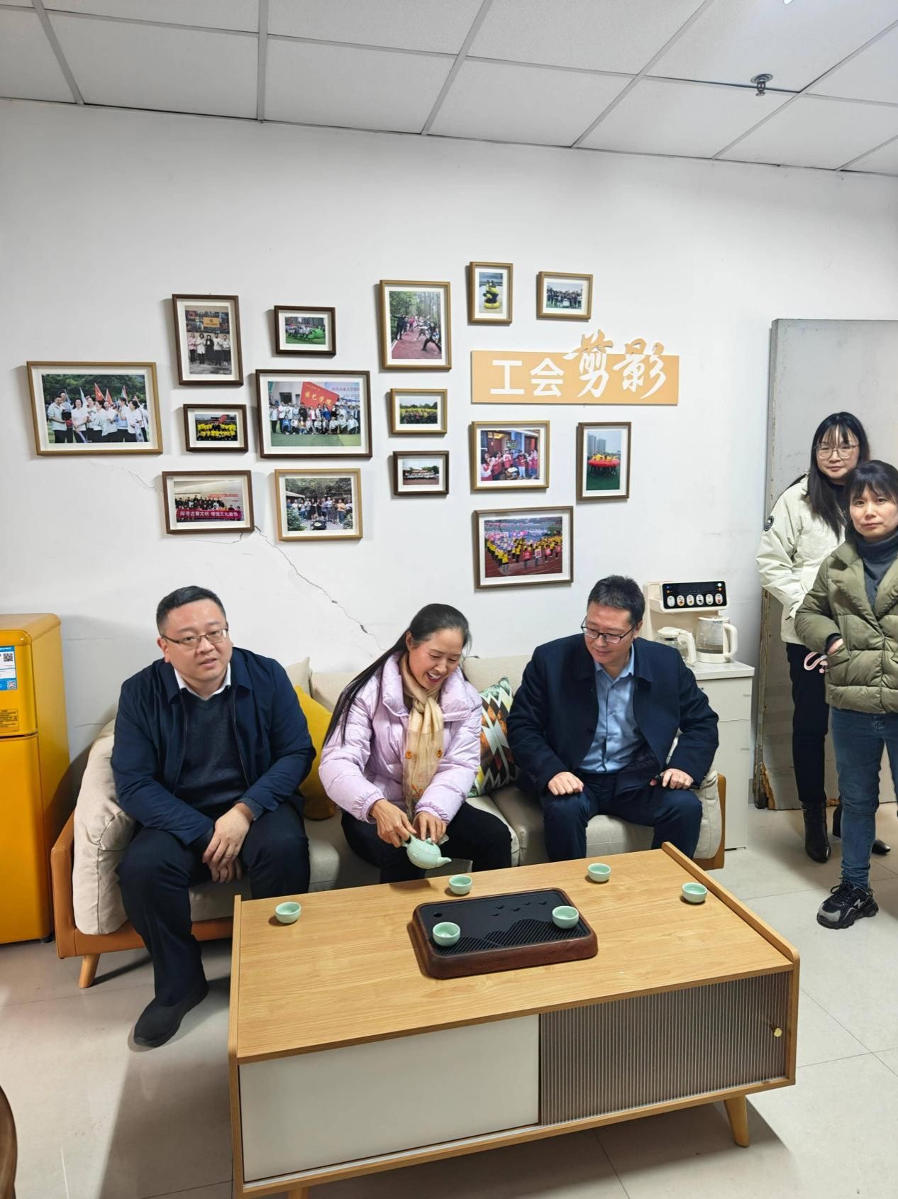 随后,袁志香与龚荣高共同揭幕,现场掌声热烈。揭幕结束后,与会人员有序参观了工会小家。小家规划有两大功能区:休闲养生区雅致温馨,可供教职工品茗休憩、交流畅谈;运动区器械齐全,为老师们健身锻炼、舒缓疲惫提供便利。两个区域墙面均布置了照片墙,定格了工会活动中教职工的精彩瞬间,尽显“家”的温情。大家驻足体验设施,相互交流感受,满是对这个“新家”的喜爱。