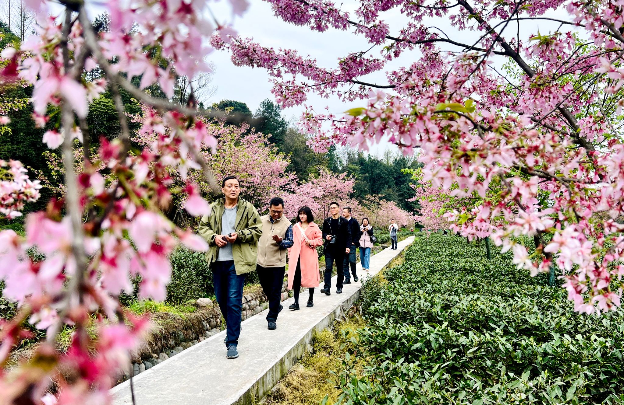 浸润着春天甜美的气息,会员们徒步穿行于樱花与茶山之间,欣赏美景,拍照留念,一路欢声笑语。活动同时开展了当地茶叶产业调研和茶文化体验,老师们与茶农进行了深入交流,了解茶叶种植户的产业需求,同时也体验了采茶、制茶过程。