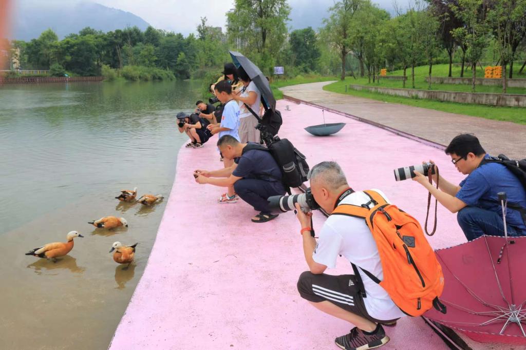 学习完野生鸟类拍摄技巧后就是亲近鸟类,观赏拍摄鸟类的实践拍摄环节。摄协老师们走进鸟语花香的天全慈郎湖,观赏和拍摄野生鸟类。慈郎湖占地280亩,在生物多样性保护和发展生态经济大背景下,天全县政府因地制宜在慈朗湖上游引水打造建设观鸟人工湖。这里有国家一级重点保护鸟类黑颈鹤、黑鹳、中华秋沙鸭及二级重点保护鸟类鸳鸯、长尾鸭、钳嘴鹳等,城市生态和鸟类保护水平高度在国内城市中有自己特色。