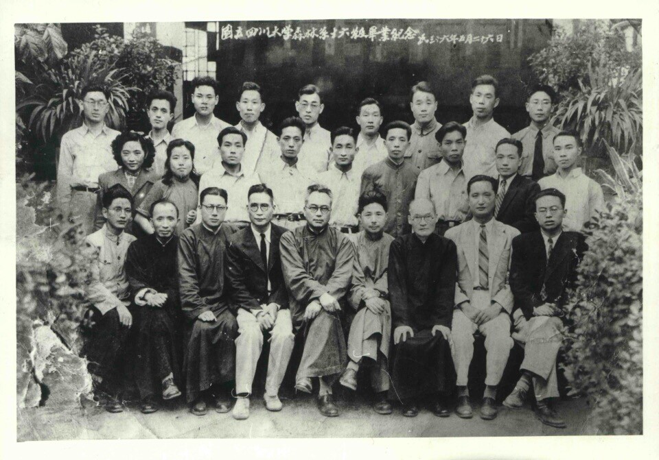 图:1947年,国立四川大学农学院森林系毕业照,前排右三为佘耀彤,前排右四为彭家元,前排左三为李萌桢,后排左三为佘斯盛。