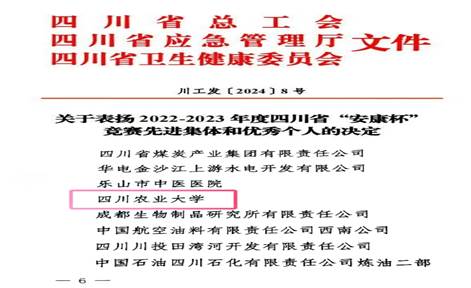 近日从省教科文卫工会获悉,省总工会、省应急管理厅、省卫生健康委员会联合发文表扬2022-2023年度四川省“安康杯”竞赛先进集体和优秀个人,我校获评四川省“安康杯”竞赛优胜单位。全省受表彰的78个企事业单位中,我校是唯一获得此殊荣的高校。