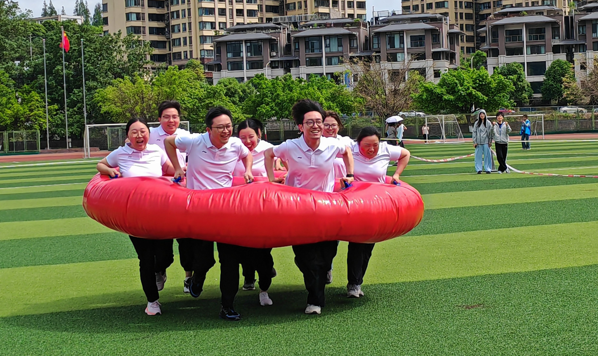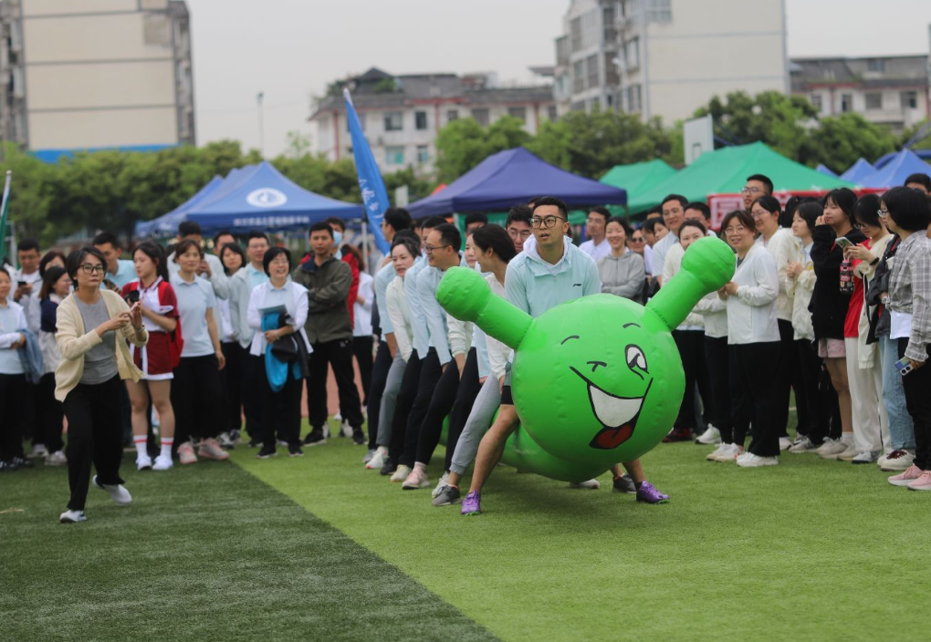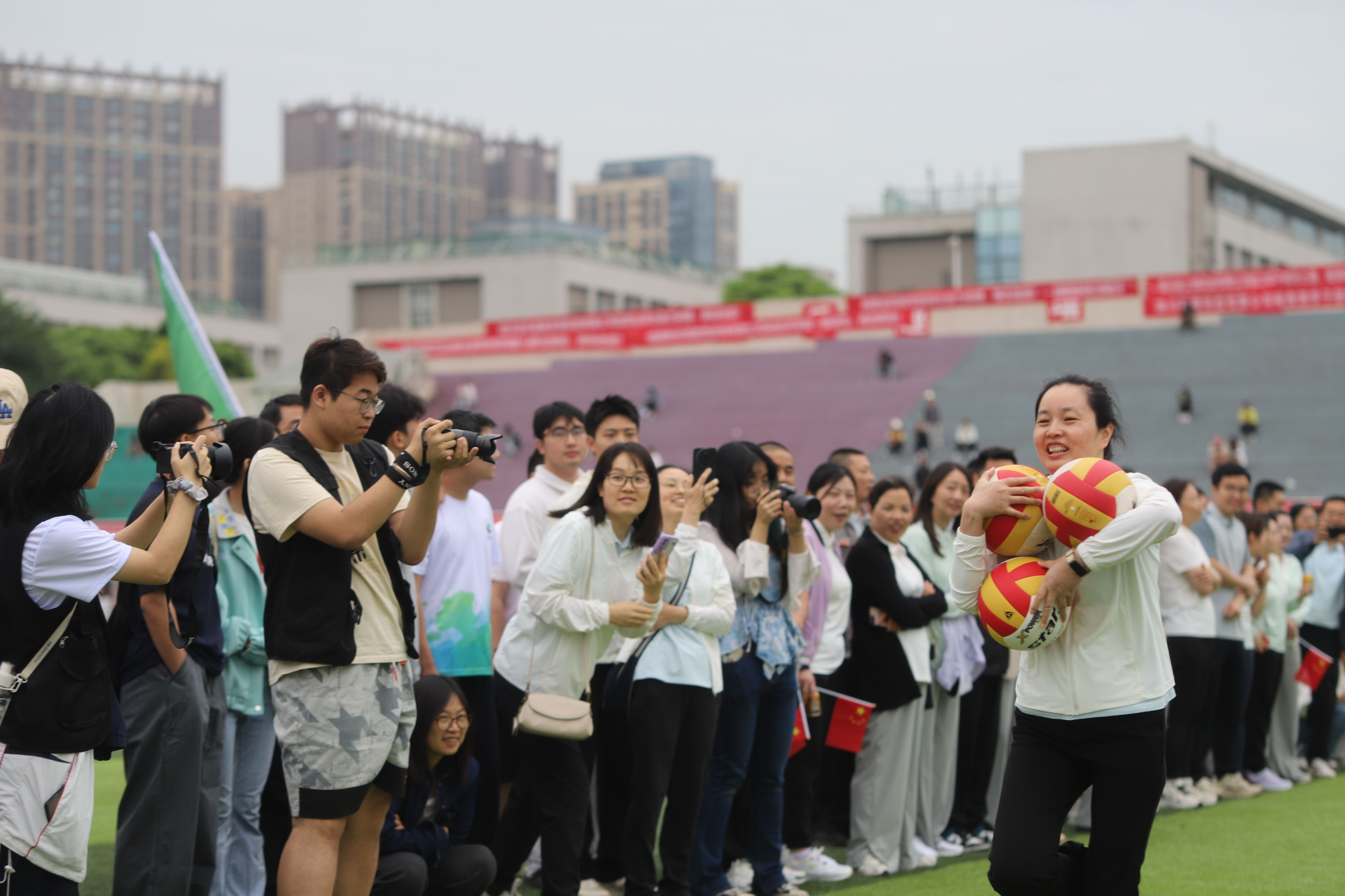 竞技项目紧张激烈,集体趣味项目也精彩纷呈。“集体跳绳”的节奏韵律、“抱球接力”的默契传递、“八仙过海”的奇思妙想、“毛毛虫竞速”的憨态可掬,让运动场瞬间变身为欢乐海洋。43个分会近1400人次走出日常的办公环境,积极投身到运动场上,相互鼓励,相互配合,尽显团队的默契与团结,赢得在场观众的阵阵喝彩。莘莘学子或围坐欣赏,或摇旗呐喊,为老师们加油鼓劲,营造了一幅幅美好的画面。