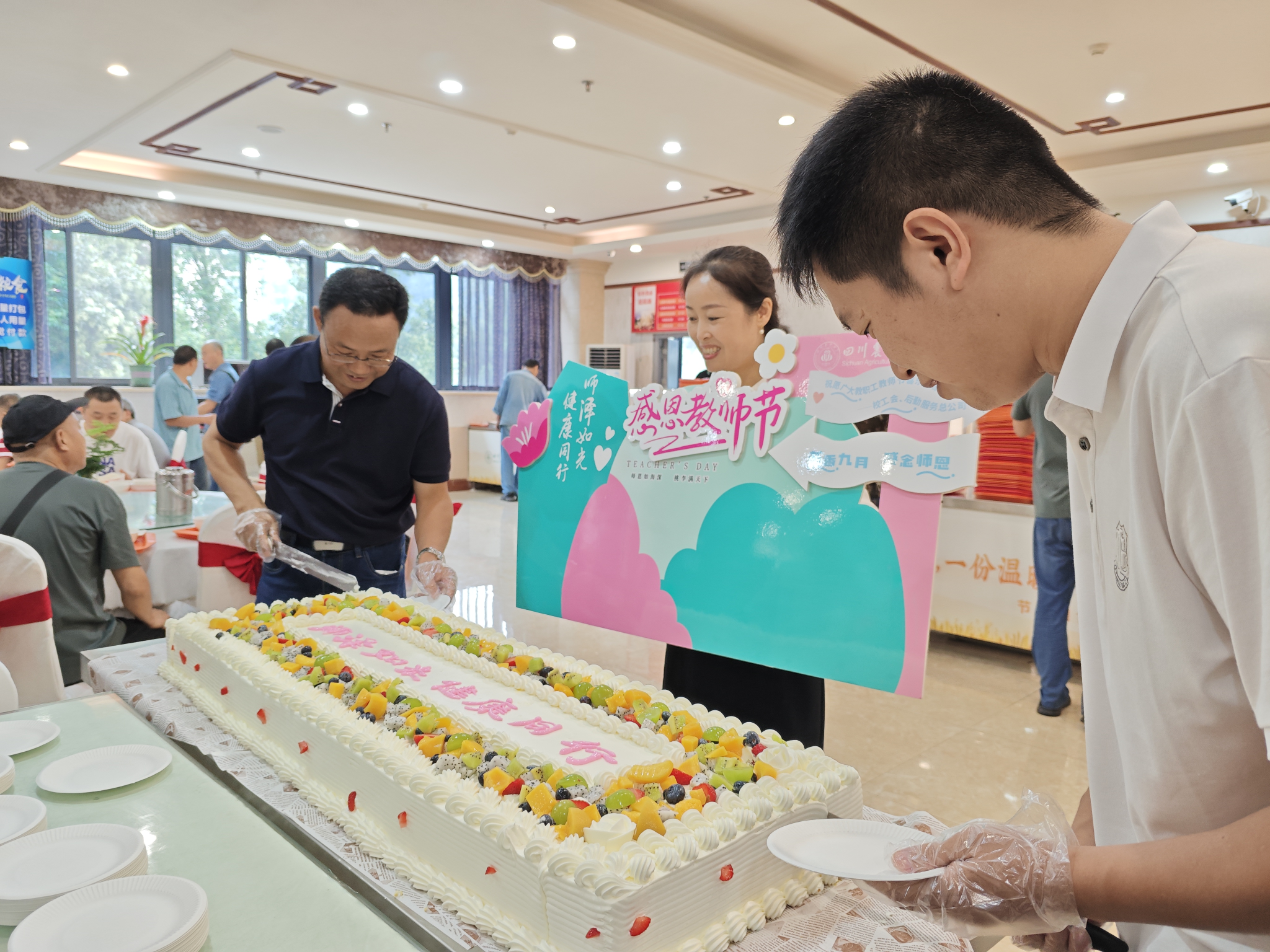 11:50活动准时启动。在都江堰校区,学校党委副书记张强与新聘教授代表侯超平共同切开节日蛋糕,将甜蜜递到教职工手中;雅安校区由校工会副主席杨志钢、新进教师代表理学院杜利杰,成都校区由教代会主席漆雁斌、新进教师代表风景园林学院李倩分别参与切蛋糕,开启分享时刻。当各校区第一块承载着敬意的蛋糕分切完成,食堂工作人员协同糕点师将蛋糕分切并迅速传递给每位用餐教职工,甜蜜滋味让大家增强归属感与幸福感。