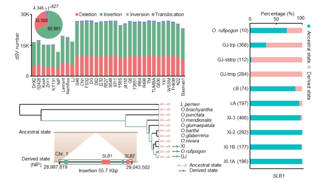 揭示这些结构性变异的方向对理解水稻的进化和驯化遗传基础也有重要意义。例如有研究认为,籼稻群体中两个与植物激素“独脚金内酯”合成相关基因SLB1和SLB2的缺失是被人工选择到的。但此次研究分析,发现很可能是粳稻中获得SLB1和SLB2基因序列,或因其能帮助磷的吸收提高产量而被保留下来。
