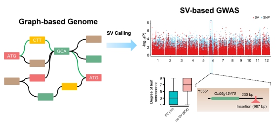 图形基因组的出现正好解决了这一难题。它突破了传统线性基因组只能存储一个个体遗传信息的局限性,可以存储、展示某类群中不同个体的遗传变异信息,从而真正代表一个类群的遗传信息。结合鉴定到的大量结构性变异,研究人员首次构建了水稻图形基因组,是水稻中迄今最为完整的基于图形结构的泛基因组。该论文被Cell审稿人评价为“泛基因组学研究的经典之作”。